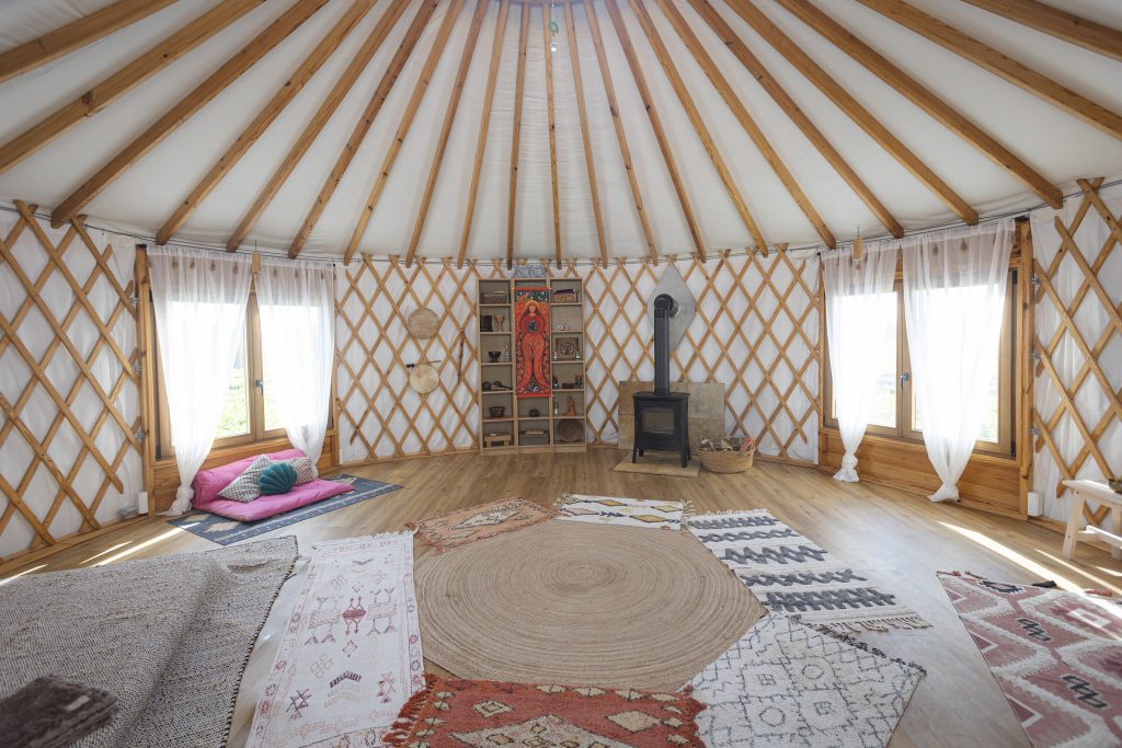 Tradicionalmente se construía con una estructura de madera cubierta de fieltro y tejidos, aislando del frío extremo y del calor del verano. Hoy, los acabados se han adaptado a materiales ignífugos adecuados a la legislación europea. Durante siglos, la yurta ha sido símbolo de comunidad, adaptabilidad y respeto por la naturaleza.